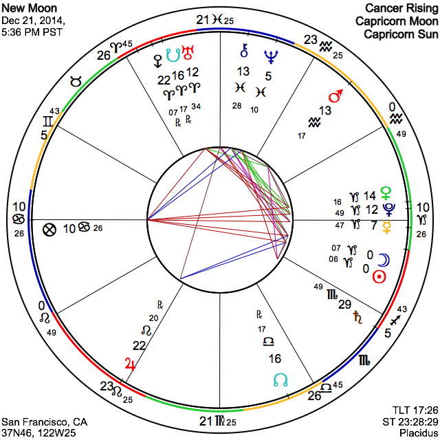 Sunday afternoon and evening's Capricorn New Moon, the starting point for another monthly lunation cycle, follows by only a few hours the Winter Solstice, which can be thought of as the starting point for the entire year. This factor alone makes this lunation far more significant. Because the New Moon is at the very beginning of the sign of Capricorn, the sign that Pluto occupies, just as the storied Uranus-Pluto square in this mid-month period completes its sixth of seven exact alignments, there is a further emphasis on radical transformation as a theme. Uranus remains in extremely close aspect with Pluto; only one quarter of a degree from an exact square, and furthermore has stationed to direct motion earlier in the day, leading to a time of great intensity of Uranus-Pluto equal to if not greater than last weekend's precise mathematical moment of exactitude. Since this New Moon is the kick-off to the following month and year, we are therefore in for a season of strong personal and societal evolution for the following four weeks, and actually through at least the first half of the 2015 year.