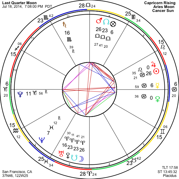 The other important feature of this quarter Moon shift in the energy is that the Sun makes a perfect square to Mars as well, while the Moon opposes him. This indicates that we are raring to go, go, go into the flames of fast action, although simultaneously the brakes are put on all this forward motion. As we look deeply inside, and as we visualize new possibilities for ourselves, represented by Uranus, this conceptualizing and action urge does not easily find its resolution, because there is additionally the competing energy to take everything in slow and in stop mode, as symbolized by an almost stationary Saturn. The presence of Saturn does imply that there will be gains in wisdom and self-understanding through our efforts, as he remains inconjunct to Uranus for many weeks, including the rest of July and most of August.