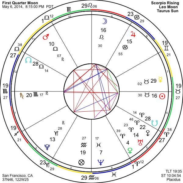 Tonight's First Quarter Moon, in Leo, is a special one, partly just because of being the quarter phase from the recent solar eclipse in Taurus that featured Uranus and Pluto in square and a slowing retrograde Mars. With these two recent eclipse cycles, in April and now in May, there has been enormous evolutionary pressure upon us all, in subtle and not-so-subtle formulations, enjoining us to really start to pay attention to what is happening to us on the inside. The Uranus-Pluto square remains in close aspect, within a degree, so that its symbolic influence is still quite strong, which could be summarized as massive change inspired by revolutionary new awareness that is slowly creeping in. This is fading somewhat over the summer, only to come roaring back toward the end of the year, peaking in mid-December for the sixth of seven exact hits.