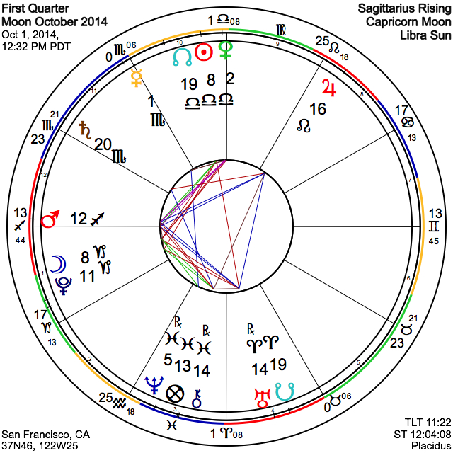 The Sabian Symbols for this quarter Moon are instructive. They are, for the Sun, in the ninth degree of Libra: "Three 'Old Masters' hanging on the wall of a special room in an art gallery" This reminds us of the past and of making use of it in the present moment by memorializing the best of what it has to offer. For the Moon in the ninth degree of Capricorn, we have: "An angel carrying a harp." This symbol seems to speak to something that calls upon us from out of the cosmic energies floating around and through us, to inhabit our higher selves. We can only do what we can do. We are however being enjoined or perhaps gently nudged, by the agency of a loving cosmos to move further along the arc of our necessary evolutionary development.