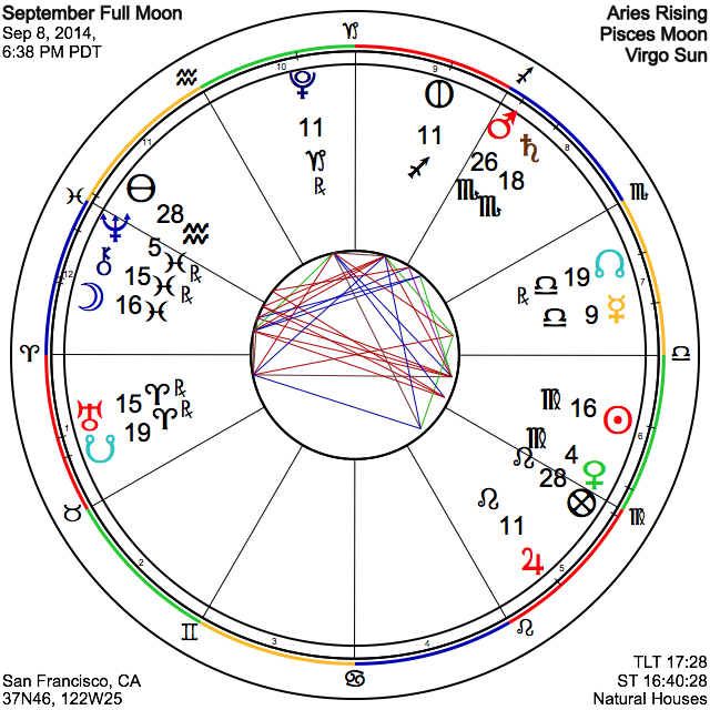 Monday evening's Full Moon represents an opportunity and also a challenge, because the Sun and Moon, aligned along the Virgo-Pisces axis in middle of their respective signs, are also aligned with tiny Chiron, currently occupying the 16th degree of Pisces. Venus is now in Virgo as well, and almost exactly opposes Neptune in the early degrees of Pisces. There is also a ton of built-up energy revealed in this Full Moon configuration by a Yod to Jupiter in Leo from Pluto and the Moon/Neptune midpoint, producing a definite feeling of angst and inchoate desire. The Full Moon by the nature of this lunar phase typifies the fulfillment of the first half the lunar cycle that began with the Virgo New Moon of August 25th. There is therefore a culmination of some arc of development that began two weeks ago.