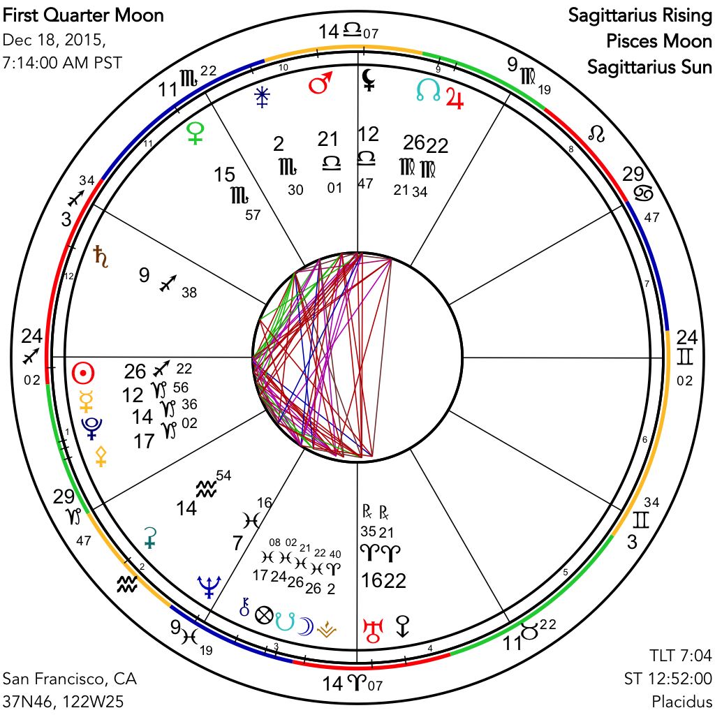 Friday's First Quarter Moon in late Pisces is especially interesting for taking place directly on the Moon's South Node, signifying inheritance from the past. There are additionally several quite important outer planet interactions to take note of, as has been the case with all these recently quite strong lunations, including the New Moon of this past Friday. Last weekend's lunation with Mars opposed to Uranus kicked off this very interesting Sagittarius and Winter Solstice cycle that will lead us into the new year of 2016. In this current configuration, inner and outer planets again combine, with Mercury in close forming conjunction with Pluto, just as Uranus square Pluto comes to within two degrees of exact. The revolutionary and transformational ardor with which we may be facing the turning of the year becomes even more fully emphasized, implying that major metamorphosis is again coming to us, both individually and collectively. Our changes are still rocking our life raft as we head over the waterfall of this powerful end-of-year timing. Perhaps most importantly, with prominent Mercury, is the increased awareness implied on our part, regarding of what our transformation actually consists. When we act from unconscious places within us, as is usually the case, we have little information by means of which we can consciously integrate our changes and challenges with what we truly want, deep down, for our lives. The opposite is true now, to the extent that we can allow ourselves to feel and recognize, in this important turning of the year, what it is that we are truly up to.