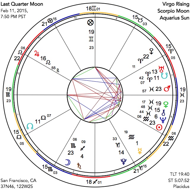 Wednesday evening's Last Quarter Moon represents a very intriguing configuration, with all the planets except for Jupiter contained within an almost perfect inconjunct aspect between the Moon and Eris. Jupiter is therefore once again greatly emphasized, by virtue of being alone in his half of the Zodiac, and aspecting Mars, Chiron, Pluto and the Sun, directly opposing the last within about six degrees. This lunar phase also indicates a shift in perspective, which is made all the more poignant by the station of Mercury to direct motion on the morning of this same day. As Mercury stands still in the sky it is far more powerful, and additionally closely aspects Chiron, Saturn and Uranus, producing a strong meditative moment for thinking about stasis and change. We therefore have a great deal of heartfelt courage now and also our fears are very much in evidence, as we continue to deal with problems of massive income inequality, global climate change and unrelenting Middle East warfare. Still there is a positive stance that is possible, taking the position that the worse it gets, the more mass consciousness about these problems can actually increase.