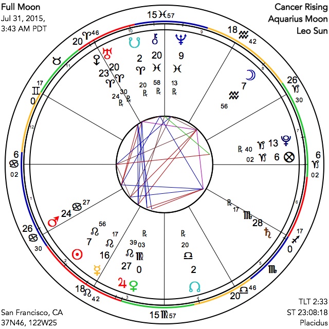 In this Full Moon configuration as well, retrograde Venus is found at the very beginning of Virgo and about to re-enter Leo where she will reside for the next nine weeks. As Venus retrogrades through this fiery sign, and conjuncts Jupiter once more, they re-create the fabulous light show that we saw in late June. This aspect perfects on August 4th, with Mercury joining in a triple conjunction in the same timing as the Last Quarter Moon, on the evening of August 6th. In the days following this Full Moon, Saturn is stationing to direct motion so that he remains in almost perfect square with the Venus-Jupiter forming conjunction. Saturn does not change from its current degree and minute as Venus and Jupiter meet in the same degree of late Leo next week. With Saturn so prominent for at least these next two weeks of early August, we will have quite a good dose of the limitations and restrictions that he famously symbolizes, as well the long-term lessons for which Saturn is also known. It might in fact prove to be a great time to read the work that noted psychological astrologer Liz Greene made her initial reputation on, referring to the positive side of this ancient archetype, Saturn: A New Look at an Old Devil.