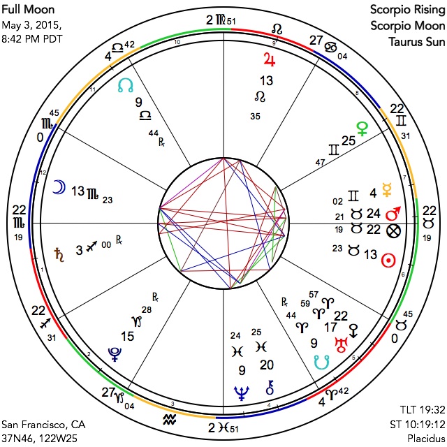 Esoteric astrology and psychology, principally the work of the well-known 20th Century Theosophist Alice Bailey, postulates seven rays of cosmic manifestation, with this earthly laboratory considered a Fourth Ray enterprise, or Harmony through Conflict, and this is just what we see here symbolized in this very potent Full Moon configuration. This implies that this Sunday and Monday could represent an important turning point for each one of us, in the midst of our soul-level evolution. It is vitally empowering that we acknowledge our humanness to the fullest extent, while continuing to dwell in spiritual realms of higher imagination.