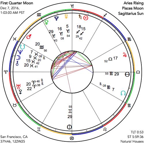The Sabian Symbols for this First Quarter Moon may be instructive. They are, for the Sun, in the sixteenth degree of Sagittarius, “Sea gulls watching a ship.” This indicates progress, as on a journey, on both a personal and a naturalistic level, giving therefore signs of optimism, and reminds us that we are, as always, bound by Natural Law. Marc Edmund Jones references “the individual’s realization that one’s personal interests are served only as one maintains an increasing vigilance in their own behalf… what [a person] fails to claim definitely for himself is promptly surrendered to the devices of someone else.” For the Moon, in the same degree of Pisces, we find, “The flow of inspiration,” symbolizing, in Jones’ words, “spiritual power,” and “practical potentiality.” He goes on to state that “Everyone is himself [or herself] as he [or she] puts their talents and skills to a real test, welcoming each new challenge.” In the immortal words of Longfellow we might add “Let us then be up and doing/ With a heart for any fate/ Still achieving, still pursuing/ Learn to labor and to wait.”