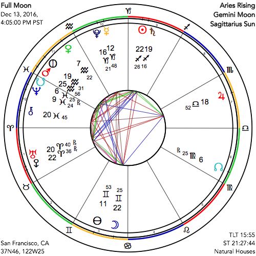 And Eris is once again highlighted in the configuration of this Full Moon. The Sun at 22 Sagittarius is in a trine with Eris at 22 Aries that is exact to within ten minutes of a degree. The prominence of Eris is strong this entire month, since Eris was also closely aspected by the Sun and Moon in the Sagittarius New Moon that kicked off the current lunation cycle, implying that everyone is stimulated now to take a stand for what they sincerely intend. We can see this in current events and activities all around us. The Standing Rock protest against the North Dakota pipeline project shows no signs of abating, while the oil companies, equally sure themselves of what they stand for, principally short-term profits, and buoyed by the prospect of a new U.S. president that will be sympathetic to their cause, show no sign of backing down, either. Meanwhile the city of San Francisco declares that they will protect the rights of productive illegal immigrants against unnecessary deportation, in spite of what might come at them from a newly Republican White House.