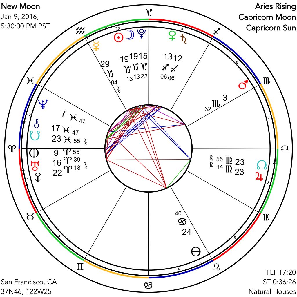 Jupiter is quite prominent in this configuration also, being conjunct the Moon's North Node, signifying moving onward with our lives. Being in a close inconjunct at this timing with the new planet, Eris, adds to this factor. Eris can be characterized as a spiritual warrior energy for soul intention, and is a factor that is very prominent as well in these current skies. Eris stations to direct motion on the day of the New Moon, and Uranus is close to Eris now, in forming conjunction that culminates in several exact hits over the summer, adding to the prominence of Uranus in the astrology of 2016. Uranus is also getting into an even more exact square with Pluto, as the January month unwinds, to a little more than one degree by month's end. Although in mid-February these two powerhouse planets will once again begin, slowly, to separate, their "influence" lasts through to the end of the decade, as does Uranus- Eris in their conjunction.