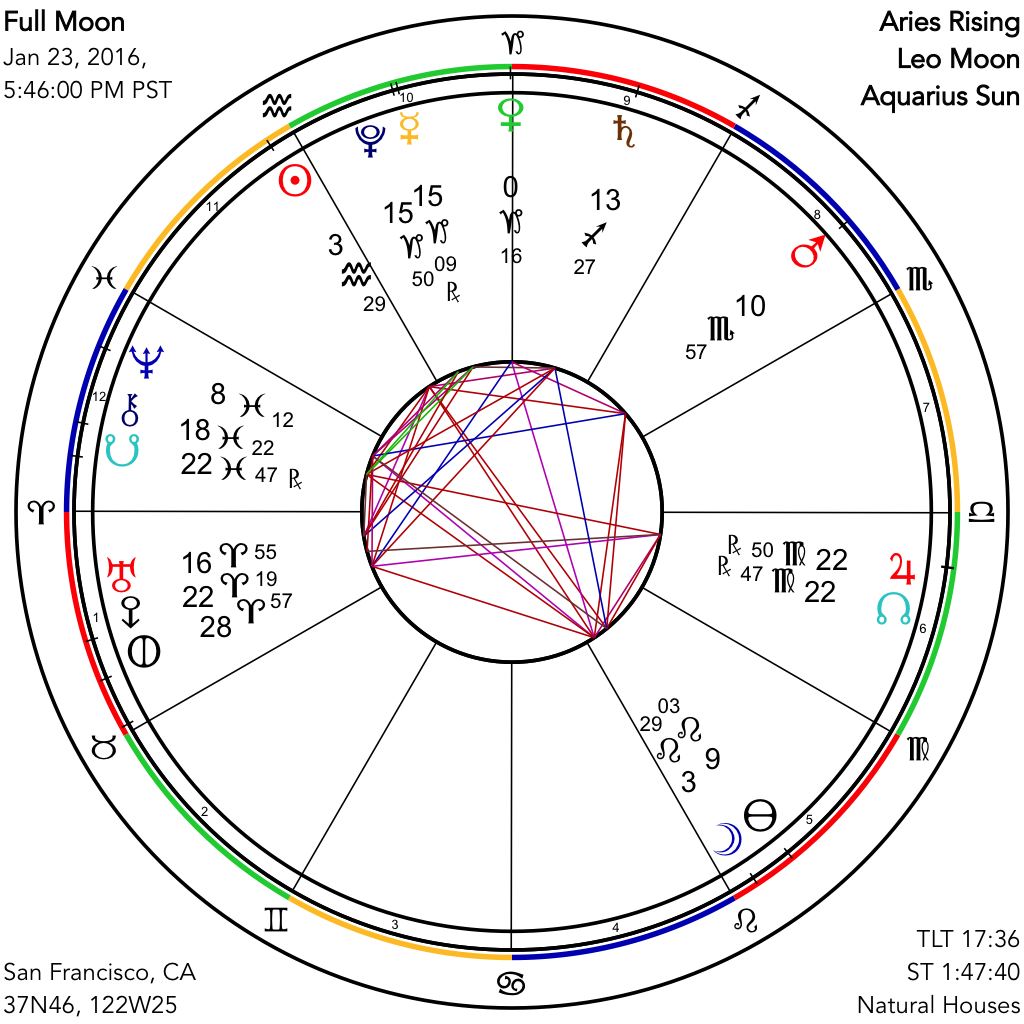 Saturday evening's Full Moon takes place early Leo, opposed to the Sun in Aquarius, with a prominent Venus, newly entered into Capricorn, and as well in the heart of the current Mercury Retrograde period. This is a rather intense time for Mercury, when it is getting ready to station in close conjunction with Pluto. Mercury passed through its second time in recent weeks of exact conjunction with Pluto, moving backwards, early on Friday, January 22nd, and will then turn around in the sky on Monday afternoon/evening, the 25th. It completes its dance with the Prince of Darkness on the late evening of the 29th. Mercury's station to direct motion, taking place next Monday, is always one of the more intense moments of the retrograde, and this Mercury placement as it stations is less than one degree from Pluto's. This implies several things: an even more intense time of Mercury Retrograde, with the usual symptoms exaggerated; an especially large dose of Pluto as it aspects both Uranus and Saturn, and greater self-reflective consciousness on the part of everyone regarding what we are up to in these intense times of major changes, very specifically what we need to let go of in order that we might grow.