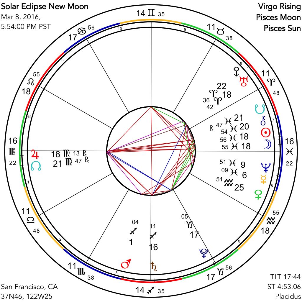 This Tuesday we have an especially powerful New Moon that is also a solar eclipse, and this serves to remind us that we are in the midst of great societal and personal transformation. This is because the eclipse degree, the 19th of Pisces, simultaneously aspects Uranus and Pluto in their square alignment, active over this entire decade of the "turbulent teens," and both ends as well of the forming square between Jupiter and Saturn, of much shorter term but still a major factor in these spring skies. The Sun and Moon also aspect Chiron, the Wounded Healer, less than a degree away from this extra-potent New Moon, speaking to feelings of angst and lack of confidence. Then, too, we also would want to make note of the dark symbolism of Saturn with Pluto, and the polarity indicated by conservative Saturn in forming trine with revolutionary Uranus, while Jupiter and Uranus, in close alignment also, presage brilliant flashes of insight and inventiveness. This combination of inspirational planetary archetypes also represents deep intuitional knowing that seems to bypass the slow process of arid logic with an instant apprehension of an unusual answer to a seemingly insolvable problem. This is the up side of this configuration, while a dire sense of an extra weight of responsibility, represented by Saturn-Pluto, is also very much with us, making for a volatile and a darkly wise time period characterized by fundamental optimism, and yet with many clashes of differing viewpoints.
