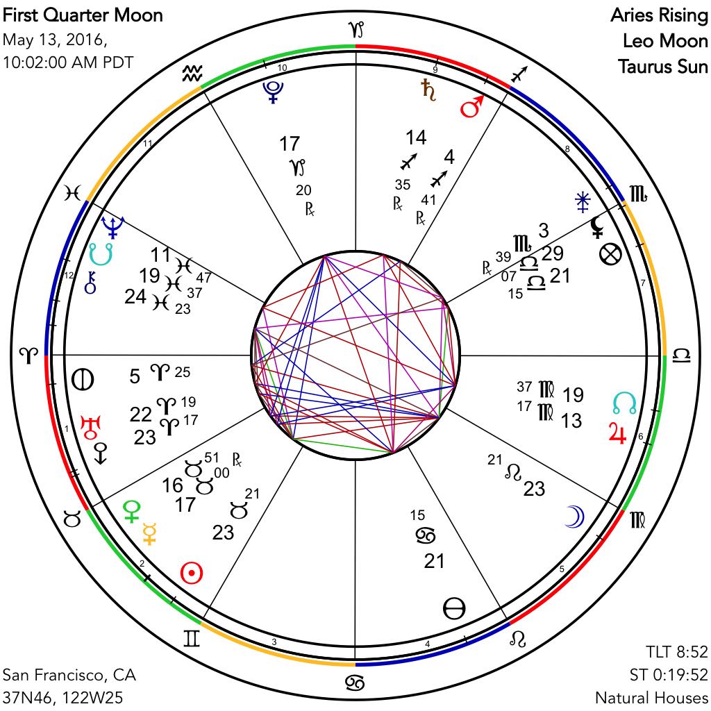 Friday's First Quarter Moon is an extremely interesting lunation, bringing a degree of tension into the equation. In addition to the framing factor of Sun square Moon at a significant degree of the signs of Taurus and Leo, this configuration also supports two major squares of much larger significance: Jupiter square Saturn, and Uranus square Pluto. This particular mid-month phase also represents one peak of the current Mercury Retrograde period, because Mercury and Venus, moving in opposite directions, come together in mid-Taurus to stimulate the grand trine in Earth between their meeting point near the 17-degree mark, together with Jupiter in mid-Virgo and Pluto in mid-Capricorn. Let's see how this plays out in terms of first the astrological facts themselves, and then their significance on both personal and societal levels.