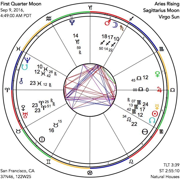 The Sabian symbols for this First Quarter Moon are of great interest also. They are, for the Sun, in the 18th degree of Virgo, "An ouija board," which fits in well with the veil between the worlds becoming thin to reveal the unseen realms within us, and those outside of ourselves also. Marc Edmund Jones references "everyday insights and intuitions," and "the completeness with which [one] is able to see experience both steadily and whole." For the Moon, in the same degree of Sagittarius, we find, "A gigantic tent." This symbol reminds us that our human life is indeed vase and multivalent, so that no one part of our experience can be separated from any of the other factors. Jones remarks upon "an utterly naïve intensification of self-consciousness [by means of which] the totality of life is brought to some single center in every moment of true excitement." Indeed, there is much to be discerned in each and every detail, as Blake would have it, "A world in a grain of sand, and a heaven in a wildflower," when we are paying attention.