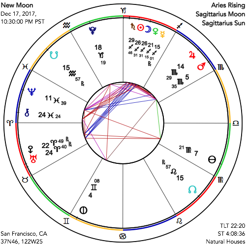 Sunday’s New Moon in Sagittarius takes place with Mercury still in retrograde, about to station, and aspecting Neptune, Lord of Illusion. This New Moon is also accompanied by a stellium of five planets total in Sagittarius, including Mercury, Venus, Sun, Moon, and Saturn. Just as with all these recent initiating lunations, since August, the New Moon itself also makes a tight trine aspect to Uranus. In addition to the enthusiasm and optimism represented by an overdose of Sagittarius, bordering on an idealistic charging of the barricades of injustice, we might well encounter surprises. The unexpected proceedings that we have been witnessing at collective levels will likely remain much the same through to the end of the year, and beyond, while out-of-the-blue events in our personal lives will continue as well, leaving the question somewhat open for each of us of where indeed we are heading. The very sky is the limit. This sort of future shock is not without its degree of angst, however, so that it seems appropriate that through this final lunation of the year, Uranus remains in tight semi-sextile to Chiron, the Wounded Healer, especially strong now with the New Moon in square. We will want to stop and think about this factor in the face of any reactivity that may come up over this rather intense holiday period.