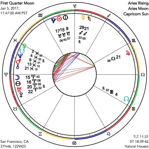 Thursday’s First Quarter Moon is interesting in that it features the characteristic aspects of this difficult month, Jupiter-Uranus, Saturn-Uranus, and Uranus-Pluto. The reason that these aspects are highlighted now is, for one, their triggering by the Sun and Moon; plus the close aspects that both Jupiter and Saturn make to Uranus and to the Uranus/ Eris midpoint. Uranus remains all this winter and early spring within two degrees of Eris, the new planet beyond Pluto that represents, as my research has shown, taking a warrior stance for that which most deeply moves you. This is quite significant for our understanding of these times that we are living through because Eris greatly magnifies any planet that she touches, meaning that this is some important sense a season of Uranus. With Jupiter opposed, we find innovation, brilliant ideas like self-driving vehicles and cheap alternative energy sources, very much in the news, as well as thinking outside the box in attempting to find new solutions to old problems. You could say that it is currently all unknown, that we can expect almost anything from the unstable world situation that we find ourselves in the midst of. The Uranus emphasis also implies that the trine to Uranus from the limitation orientation of stodgy Saturn, exact to within a degree and a half in the timing of this first quarter configuration, so still quite close, implies a push-pull of liberal innovation together with conservative backlash, or perhaps the other way ‘round. In any case we have highlighted for us in the skies above, as well as in earthly affairs here below, the extreme polarities of these fractious times.