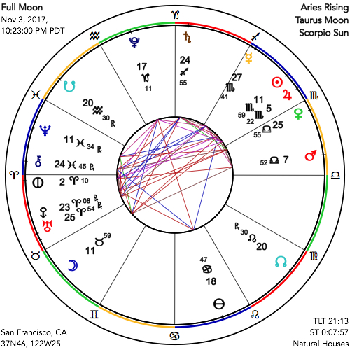 The Sabian Symbols for this Full Moon are, as usual, instructive. For the Moon, in the twelfth degree of Taurus (11 +) we have, “Window Shoppers.” This reminds us that as humans we stand apart from the material plane, even as we participate in its multiplicity. Marc Edmund Jones has this to say: “Human imagination [is] the real corrective for [one’s] experience, enabling each individual to know whether the choices he or she makes are in line with his or her desires… the keyword is Visualization.” For the Sun, in the same degree of Scorpio, we find, “An embassy ball.” Jones references, “the social dramatizations which enable each person to know whether his or her overall loyalties are bringing the self-fulfillment to which he or she aspires.” Indeed, as we ask this question we must, each of us, strive to connect with the greater realities of our existence, no matter how subtle the message or how difficult to truly recognize. And we must equally turn away from surface superficialities in order to look within ourselves for the answer.