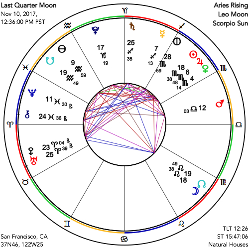The Last Quarter Moon of November 10, 2017 in the sign of Leo speaks to us of letting go of illusions. This lunar phase is always symbolic of the time period in the growing season after the harvest when the leaves start to whither and return to the earth. This is the time after the Moon’s reflective light has culminated in the sky at the Full Moon, halfway to its return to the darkest part of the lunar cycle. In this case the symbolism points to disillusionment with what was once tacitly accepted, also therefore of the necessity of negotiating what arises in the face of hidden truths being revealed. As masks, and layers of inauthentic self, become peeled away, we are asked to let go of what no longer serves to make space for a more conscious, intentional experiences of ourselves and of reality. This is also a chime with the Libra Equinox, which we just experienced a few weeks ago, and so doubly we may turn our attention to gentle darkness, coming into a greater degree of rest, reflective contemplation, and inner work.