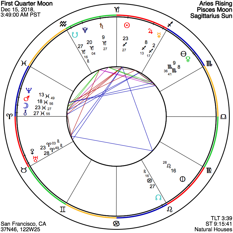 Saturday morning’s First Quarter Moon in Pisces, taking place early on December 15th, has the interesting characteristic of being at the precise degree, 23 plus, that Eris still occupies in Aries, so that the Sagittarius Sun makes a partile trine to Eris, with the Moon in perfect semi-sextile. This strong Eris placement has a bearing on how we handle what can be a difficult transition from the New Moon to the First Quarter, a lunar phase that reflects the notion of being brought down to the real. As former U.S. Poet Laureate Robert Frost puts it: