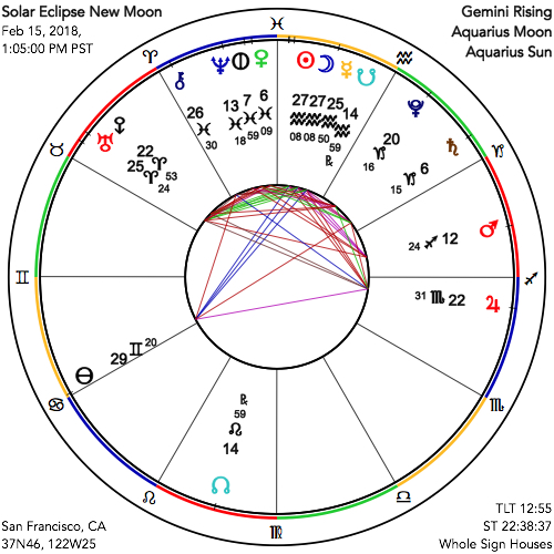 Thursday’s solar eclipse and New Moon in late Aquarius has some interesting features. Because an eclipse configuration is considered to be an especially powerful lunation, this presages a set of relationships between archetypal energies that may well last us into the second half of 2018, conditioning our collective response to this brave new year of fundamental transition. The most obvious factors are, again, the outer planet energies of Uranus, Neptune and Pluto, with emphasis on the first two of these, associated with a dawning spirituality as well as feelings of universal compassion and the dissolving of strict walls and borders. Uranus represents awakening to the full-on higher cosmic reality of Natural Law. The New Moon at 27 degrees plus of Aquarius makes a sextile with Uranus, its modern ruler, while Mars closely squares Neptune in this snapshot of time. There is a progressive attitude that is alive in the land, together with a studied opposition to this spirit on the part of an equally potent conservative backlash, as symbolized by strong Saturn. It is important that each of us find our own way through this maze so that we can understand with what we most deeply align ourselves, and where we are internally summoned to cast our vote by our actions.