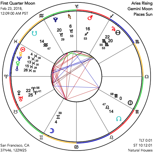 The Sabian Symbols for this First Quarter Moon are, as often, revelatory. They are, for the Sun, in the fifth degree of idealizing Pisces, “A church bazaar.” Marc Edmund Jones, chronicler of these symbols, references “the instinctive loyalties of life as manifest in community institutions, and of [one’s] ability to capitalize on the enduring allegiances that one in this way develops… as they make their over-all contribution to human achievement through [such] contacts.” For the Moon, in the same degree of Gemini, we find, “A radical magazine,” which Jones considers a symbol for “the necessary element of change in human affairs.” He comments that, “Here is the power of [men and women] to give high exaltation and dramatic force to whatever succeeds in stirring them deeply … emphasizing inner over outer compulsions.” You can perhaps see in this description the evidence of his very strong natal Eris placement. Indeed we are all in this together, and must act forcefully on our own understanding at all times, activity which yet has its directly felt influence upon the society in which we participate. As Ben Franklin stated it in the early days of the American Revolution: “We must all hang together now, or, most assuredly, we will all hang separately.”