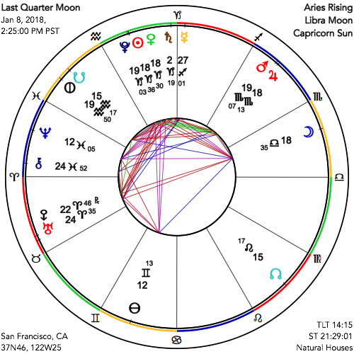 The Sabian Symbols for this Last Quarter Moon make for a nice counterpoint to these philosophical musings. They are, for the Sun in the nineteenth degree of Capricorn, “A child of five, with a huge shopping bag.” In this symbol we might be able to discern a familiar emblem for the New Year, with all its hopes and dreams intact, and with a long list of what is needed in order for us to grow as a tribe, a nation, and a world. Marc Edmund Jones references “the spiritual stewardship of mankind, as expressed in his inherent sense of responsibility for the welfare of others, and his desire to serve his community to the extreme of his [or her] particular range of skills… the total of his [or her] potentialities… an effective breadth of participation in everyday living.” For the Moon, in the same degree of Libra, we find, “A gang of robbers in hiding.” Except for the connotations of criminal activity, this is a nice symbol for hidden talents awaiting their full-on manifestation. It is perhaps because these potential powers might run against the grain of current consensus thought that the idea of the outlaw emerges, and we are reminded of Bob Dylan’s 1960s dictum, that “to live outside the law you must be honest.” Jones states, “This is a symbol of [a person’s] freedom of spirit and soul in a complete … deviation from their normal impulses or attitudes, dramatized here on the side of practical self-fulfillment.” Indeed, when we take the reins of our own personal evolution firmly in hand, we must beware of common tendencies on the part of others of lack of trust in what we are ultimately all about. When we thoroughly know ourselves, we go ahead anyway, and then our divergence from prevailing conventional attitudes is a good part of the fun.