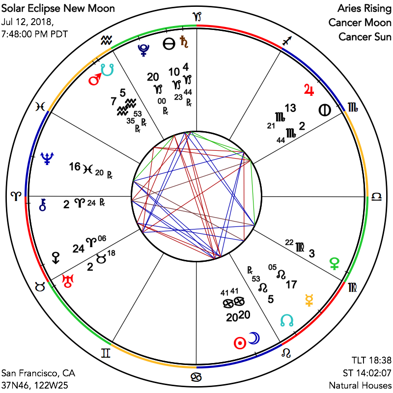 The Sabian Symbol for this New Moon eclipse is also of interest. It is, for the 21st degree of Cancer, “A prima donna, singing.” While in present-day terms this might remind us of the US president telling tales, the symbolic resonance speaks to the question of ego versus art. When we do what we do with a higher purpose in mind, we may be able to transcend petty drives for recognition and status. Marc Edmund Jones, himself possessed of a powerful Eris placement, refers to “the inevitable culmination for individual opportunity, an enduring contribution of skill and talent to whatever may entertain the soul’s recurrent and constant discovery of itself.” Indeed, we must, in the face of possible despair, attempt in spite of everything to triumph in terms of what we each can alone contribute, our own stand for what matters most, for ourselves and for the future of our society.