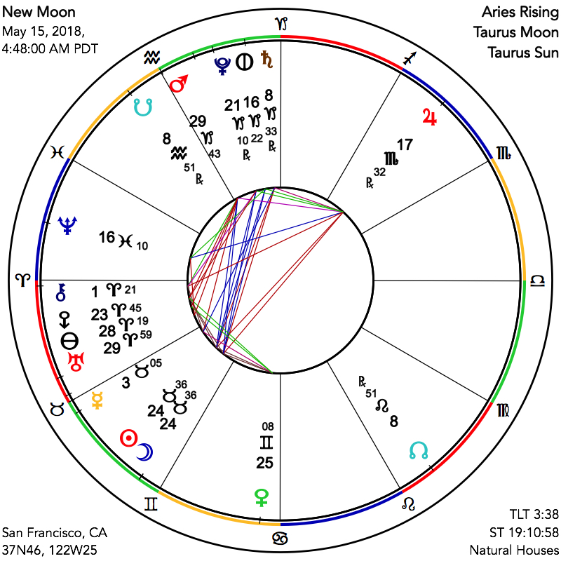 Tuesday’s Taurus New Moon is a rather intense configuration, with plenty of Pluto activation, continuing this significant astrological theme from the previous cycle. The strong Pluto presence implies that the transformational thrust of past weeks is far from over, although changing for this next thirty days in some interesting ways. For one, we are beyond the Mercury Retrograde period that characterized the beginning of the previous cycle, and colored its entire span with a touch of introspection. While Mars remains in parallel with Saturn, indicating that a certain difficulty still remains in getting things done, this current lunation represents a more active time, with Mars in the last degree of Capricorn, in partile square with the volatile, trickster energy of Uranus. You might almost say, “anything goes.” The New Moon opposite beneficent Jupiter sets an expansive and optimistic tone for the latter half of this current month. We also find this New Moon degree directly at the midpoint of Eris and Venus, themselves in close sextile, so that the archetype of the spiritual warrior is dramatically linked with relationship-oriented Venus. This continues one motif that we saw in the previous cycle of interpersonal relationships being greatly emphasized. Venus and Mars being thus featured in this New Moon context, along with Pluto and Eris, implies the transformation of partnership patternings along positive lines, and, additionally, the concept of dedicating our relationship energy to a higher purpose, possibly an unconventional one. Our concepts of individual purpose and relationship connection are thus intimately connected now to the search for meaning that most deeply characterizes these fractious, dangerous, and yet also profoundly stirring times that we are living through.