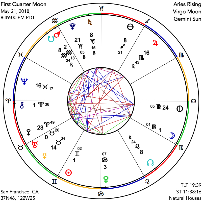 Monday evening’s First Quarter Moon takes place in the early degrees of Virgo, matching by square alignment the Sun’s own entrance into Gemini, hence in Mutable Signs. These signs indicate a flexibility to change, as do the alignments that the Sun and Moon also make to the surprising trickster archetype of Uranus, newly entered into Taurus, and Chiron, the Wounded Healer, in early Aries. The experimental and exploratory nature of this configuration is further enhanced by the recent New Moon being opposite Jupiter, while currently Jupiter is also emphasized, being found in partile trine with the nebulous other-dimensionality of Neptune, in mid-Pisces. New ideas never come easily. The difficulties inherent in the square alignment of the Sun and Moon are echoed in Venus square Chiron, Mars square Uranus, and two Yods, to Moon from Mars and Chiron, and to Mars from Venus and the Moon. This lunar phase indicates as well what Dane Rudhyar called a “crisis in consciousness” where the things that you learned in the first week of the cycle create a dissonance with what you are attempting, causing there to be tempestuous swerves and rapid-fire course corrections at this significant juncture.