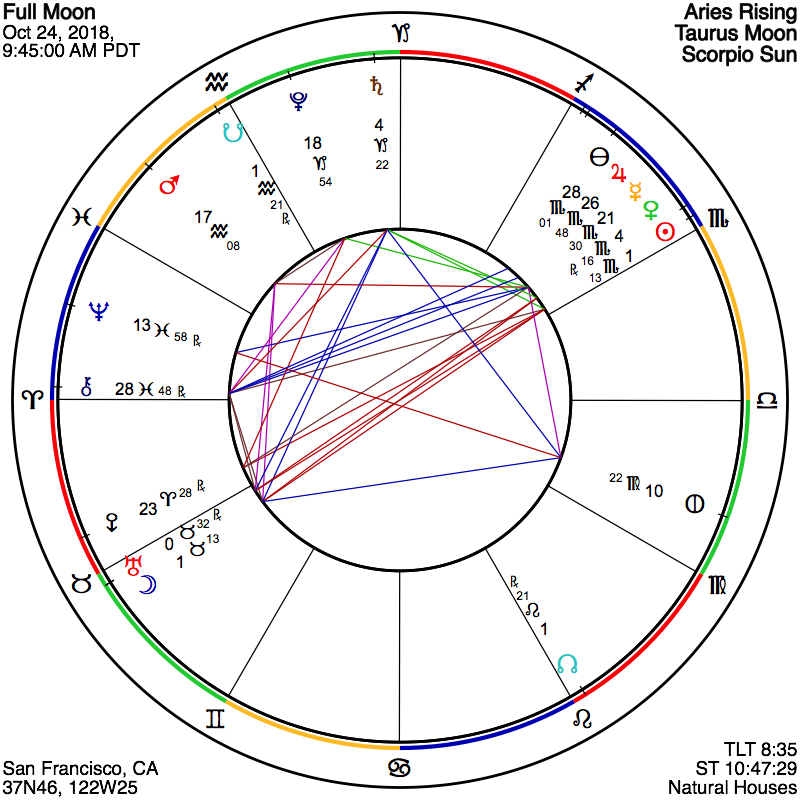 The Sabian Symbols for this Full Moon are as usual quite potent. For the Moon, in the second degree of Taurus, we find “An Electrical Storm,” reminding us of Uranus, for which Marc Edmund Jones writes, “There is here a catharsis of nature, mirroring the capacity of every individual for discharging the whole complex of strain in his affairs and so clearing the way for a more genuine progress ahead, [leading to] transformation.” This echoes the Uranian symbolism of finding greater freedom and authenticity in our individual expression. For the Sun, in the same degree of Scorpio, the symbol is “A broken bottle and spilled perfume.” Jones calls this, “a symbol of [a person’s] real power in making their permanent impact on others, dramatized at each moment of issue and crisis by a completeness of the self’s flow out and into every last ramification of the given experience.” Here we encounter a bold invitation for each of us to express the very essence of our truest nature, even in times of crisis and challenge, referencing the depth of power that lies in our human ability to have profound impact on one another. In this time of intensity, may we each have the courage to face the unknown, so that we might experience the freedom to relate and express as our truest, most brilliantly authentic selves.