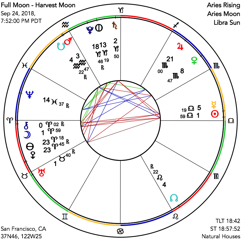 Monday evening’s Full Moon in early Aries takes place at 7:52 PM on September 24th, PDT, and of course this would be late evening in Washington DC, early morning the next day in Europe and points east. The two quite significant features of this Full Moon configuration are the conjunction of the Moon with Chiron at the Aries Point, and the T-square that the Sun and Moon in their opposition make to an extremely prominent Saturn in Capricorn. The Sun and Moon also closely aspect Uranus in Taurus. This is an incredibly dynamic configuration, emphasizing the inherent difficulty of these times that we are currently living through. As is also indicated by the outer planet emphasis of the preceding New Moon from September 9th, we are involved in an intensely transformational cycle that began early in the summer, and has been going strong ever since. The polarization of these times is clearly represented by the close 1-degree major aspect between Uranus, now in the second degree of Taurus, and prominent Saturn. When we look around, and digest the news headlines, certainly in America at least, the battle between progressive and conservative elements of society seems to be heating up even further, with the fight to confirm or to deny the recent Supreme Court nominee with strongly conservative, even reactionary, predilections, and who in a dramatic turn of events has been accused by a highly respected psychology professor of attempted rape thirty years ago. The outcome in the Senate remains completely up in the air as of this writing. The stars give no clue to the ultimate outcome, although the Saturn and Uranus empowerment of this Full Moon is indication that these deep societal divisions will intensify even further in the coming weeks.