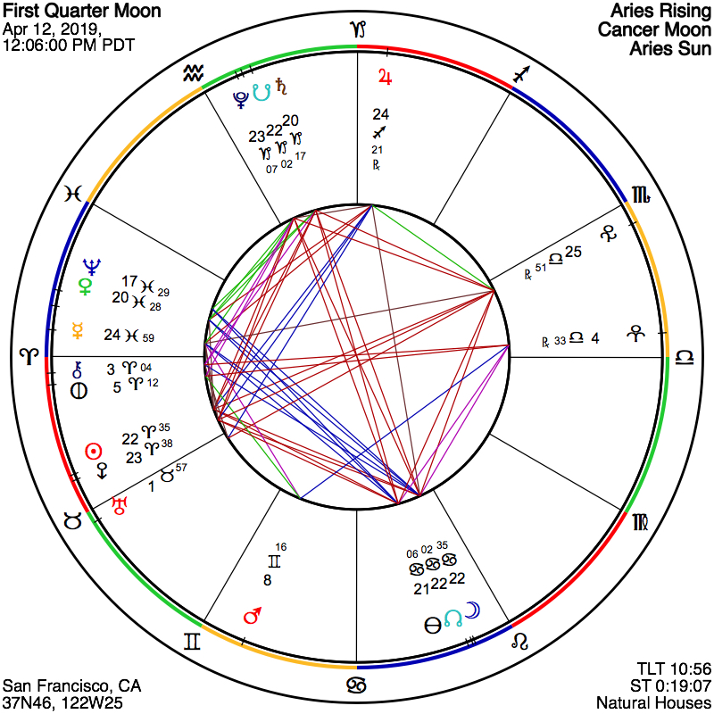 The First Quarter Moon of April 12th, at 12:06 pm PDT, accentuates the intense evolutionary developments that are currently churning in collective human consciousness. This lunar phase represents the springtime stage when a plant is working hard to establish itself, when difficulties are encountered, and when there is required a tremendous output of energy. So, too, is this mirrored in the lunar cycle for each one of us in terms of personal process. Because this is the time when the intentions and seeds that we’ve sown on the New Moon are being put into action, effort and stamina is essential to put forth what is required for our vision to blossom and to grow. The Moon, at 22º of Cancer, in her rulership, is square the Sun at 22º Aries, while we also find Saturn and Pluto, paired, in similar degrees of Capricorn, thus in square with the Sun and opposite the Moon, and forming a T-square to the Aries Sun degree. This is an immensely potent configuration. Saturn and Pluto remain in close parallel to each other, and are now as near to longitudinal conjunction, at about 2 ½ degrees apart, as they will get until the very end of this year. This is pending the retrograde of Pluto on April 24th and Saturn on the 29th. The difficulties of this lunar phase are thus greatly extended in this Saturn-Pluto presence, that serves to indicate that we are indeed on the griddle of life process, facing tremendous changes on both a societal and a personal level, as we move toward the climatic year of 2020. We also find within these placements an emotional dimension of impulse and yearning to move forward; with deep consideration of the past, as well as a fervent hunger to proceed onward into the future.