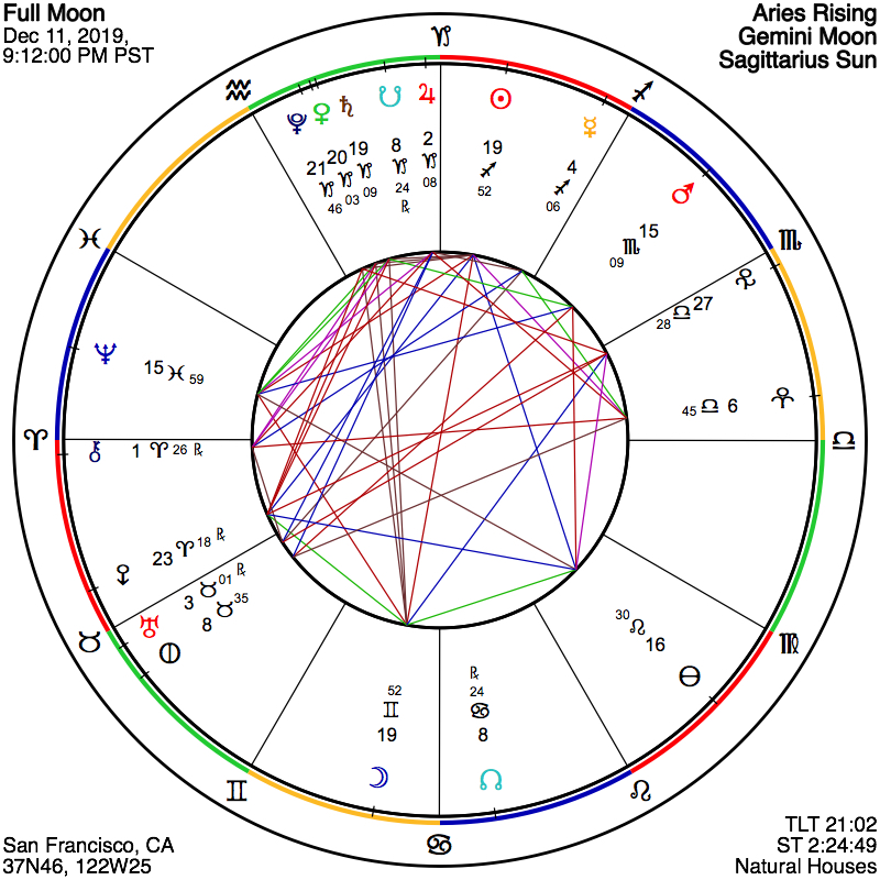 The Full Moon of late Wednesday, December 11th, in the sign of Gemini graces our skies with opportunities for fresh contemplations and a sneak peak perspective into the powerful astrology of 2020. This Full Moon comes to exact at 9:12pm PST / 12:12 Thursday day EST, taking place at 19+ degrees of Gemini, a mutable Air sign. The influence of this Full Moon may thus bring our awareness to the double edged sword of the human intellect. Gemini represents the realms of mental acumen, quick wits, and the capacity to flit from one idea to another as easily as a leaf floats on the wind. While Gemini reminds us of the brilliance of the human mind, it also echoes the pitfalls of fickle scatteredness that can come with such mutability. We might also note that we currently have a dose of Capricorn that is quite heavy (and I mean heavy) emphasizing societal structures, responsibility, integrity, and lasting legacy. Perhaps this Gemini Full Moon can grant us a certain degree of light-footedness, together with the ability to adopt new thought patterns and beliefs. The challenge here is to utilize the mind for its incredible ability to imagine, innovate, and problem solve, without getting lost in distraction, confusion or thought forms that do not support the true task at hand – whatever that might amount to for each one of us in our sense of our individual purpose.