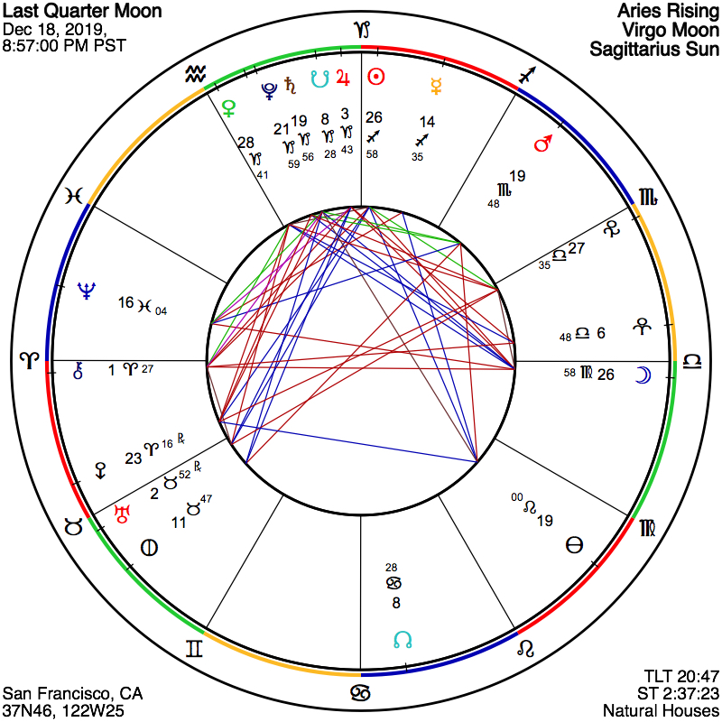 On December 18th, the Moon wanes into the Last Quarter Phase, coming to her exact square aspect with the Sun at 8:57 pm PST, near midnight on the east coast and later still in Europe. With the Moon occupying the 27th degree of Virgo, we can find expressed in this configuration the themes of refinement and purification that this sign represents, as well as corresponding themes of shedding and release that are represented by the Last Quarter Moon phase. As 2019 draws to a close, this day and the few days surrounding this point in time mark an important juncture. We are finishing up the last complete lunar cycle of the decade, and also the last before heading into the eclipse season that begins just one week later on, taking place on December 25th with a Solar Eclipse in the early degrees of Capricorn. A further Lunar Eclipse will take place in Cancer on January 10th, 2020. Consider that this window before the Solar Eclipse represents an incredibly valuable time to take stock of your priorities, prune extraneous branches from the symbolic tree of your life, and make use of a high degree of discernment regarding who and what you are. You will want to consider as well what you are welcoming into your awareness and reality in this climactic timing, and of what you are ready to start letting go.