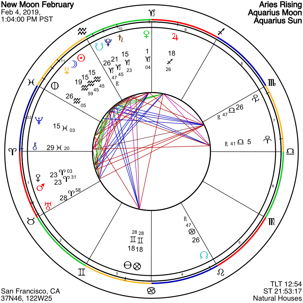 The Aquarius New Moon that takes place on Monday, February 4th, represents another in the ongoing series of lunations with powerful outer planet configurations. This one is especially noticeable, because Saturn and Neptune, in partile sextile with each other, at the 15-degree mark of their respective signs, are highlighted by the New Moon at their same-degree midpoint of 15 Aquarius. Additionally, Pluto, tied to Saturn by a close forming parallel, is squared by Mars and Eris, while Uranus is aspected by the Sun and Moon, in quintile, and also by a trine from Venus (in semi-square with the New Moon) and by a parallel from Mars. This New Moon therefore strongly features the outer planet energies of Saturn, Uranus, Neptune, and Pluto, and brings back a significant hit of the Uranus-Pluto square, still active until 2020, that is the defining astrological aspect of the 20 teens. This speaks to the issue of our own personal evolution, and this decade’s relentless changes on individual levels, as well as the massive cultural shift that also we find ourselves in the midst of. We may think of the trickster archetype of Uranus as many things: unexpected events, surprise enlightenment, strong bursts of intuition that connect us to cosmic realities above and beyond what our logical mind is able to detect. Uranus is fundamentally The Awakener, representing a telling shock to the system that reveals the cracks and flaws, the outmoded status quo that needs to change for our continued mental health and well being, preparing the way for what follows; the wrecking ball energy of transformational Pluto, whose essence is death and rebirth. This is in reality merely life being lived. Bob Dylan might have said it best in the midst of the changing times that he was witness to and prophet of in the dynamic sixties, when he wrote that “everybody not busy being born is busy dying.”