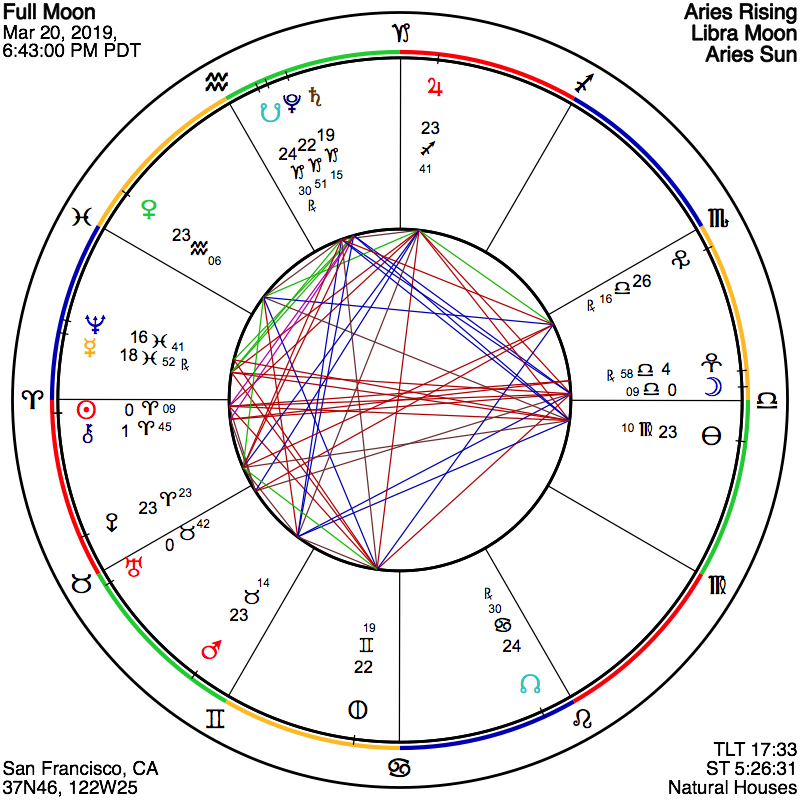 The Sabian Symbols for this Full Moon, in the classic beginning degrees of both halves of the Zodiac, are also quite interesting; being, for Aries, “A woman rises out of the water, a seal rises and embraces her.” This is a symbol of new beginnings, in a different dimension, and in this case we might recognize that dimension as a more spiritual one. For the Moon, in the first degree of Libra, we find “A butterfly made perfect by a dart through it.” This is another quite powerful symbol, of the transformation of a well-lived life into art. Together these symbols suggest that we are all currently moving through some major transitional changes during a climactic March month.