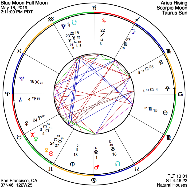 The Scorpio Full Moon taking place in the afternoon of Saturday, May 18th, late afternoon or evening for points further east, brings the two feminine signs of Taurus and Scorpio to bear upon each other. For at this lunation the Sun is in the fixed Earth sign of Taurus while the Moon is in the fixed Water sign of Scorpio, and we see both a heightened culmination of energy, and also a bridging of polarities. Taurus energy tends more towards enjoyment of the physical world, while Scorpio, not content with the surface of things, dives to the deepest depths of our psyches, supporting mysticism and introspection, a peering into the shadows of human experience. We may find our vitality informed by the earthy and grounded energy of Taurus, while our emotions and psychology could be riding massive waves of upset regarding our relationships, also symbolized by the Sun and Moon in opposition, and as well by Venus, prominent now in her conjunction with Uranus. We could also find ourselves more than a little freaked out amidst the collective cultural turmoil of these fraught times.