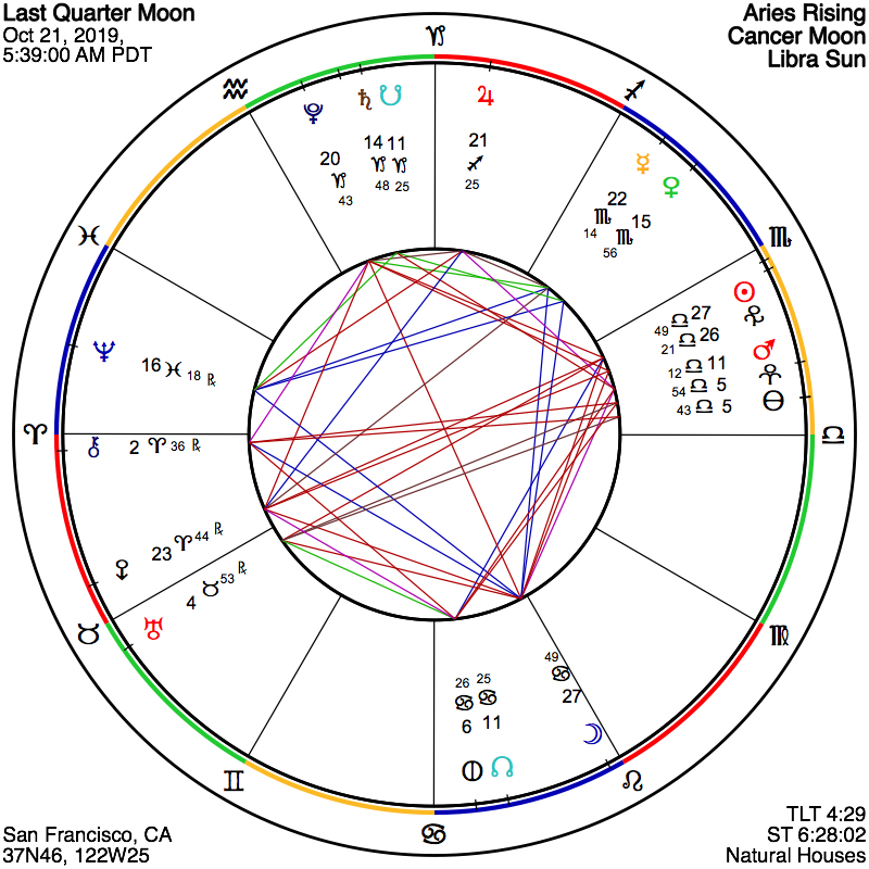The chart of this Last Quarter Moon in late Cancer gives us insight into the themes and nature of this present timing – and reminds us to also return our awareness to the most recent Libra New Moon that began the current lunation cycle (on September 28th), to recall that this entire cycle is colored by the sign of Libra- asking us to contemplate and grow in the realms of relationship and human connection. With the Moon in its home sign of Cancer, now, this lunar phase allows us insight into our emotionality and defense mechanisms, and may ask us to let go of unconscious patterns around relating, which could also translate to letting go of certain relationships or at least aspects of them that are no longer truly serving us. There is grief in letting go – be that of a behavior pattern, an identity, a person, a location, a belief system – and this Moon invites us to slow down and give ourselves the gift of space, time, and support needed to truly allow ourselves to grieve and process our emotions.