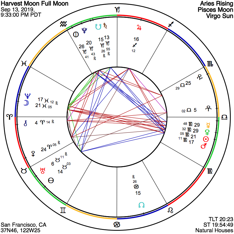 The Moon ripens to fullness September 13th at 9:33pm pacific time, at 21º+ of Pisces. This Full Moon follows the New Moon in Virgo, and brings to fruition those themes that have been at play all September, since that time. The Full Moon phase is in any case a time of culmination and ripening regarding whatever issues or energies were bubbling up in the seedtime of the cycle. Because the Virgo-Pisces axis is activated, we may see our awareness heightened around the ideas of bridging the mundane and the transcendental; the nitty gritty practical details combined with the broader strokes of imagination and vision. Near the Moon’s Pisces placement we also find Neptune, and this lends a dreamy and ethereal quality to this particular lunation. With Neptune so strongly placed, we may experience his influence in a multitude of expressions. In one way Neptune lends us eyes for divine compassion, love, hope and faith. In another, our vision can become clouded, confused, or anxious in the face of the Great Unknown. As such, this Full Moon could be a beautiful time to reflect, meditate, and connect with the Divine in whatever way feels alive and right for you, and to find and identify ways that your experience of the spiritual can be woven into the everyday moments of your life. This Full Moon time may act as a potent barometer to gauge where in your life you’re feeling clear, connected, and supported energetically, and where you might be feeling confused, scarce, anxious, or fearful. You do well to simply observe the patterns at play, and treat them with loving kindness and acceptance, intending the best for your growth and development, especially where you can see the possibility that transformation is in order.