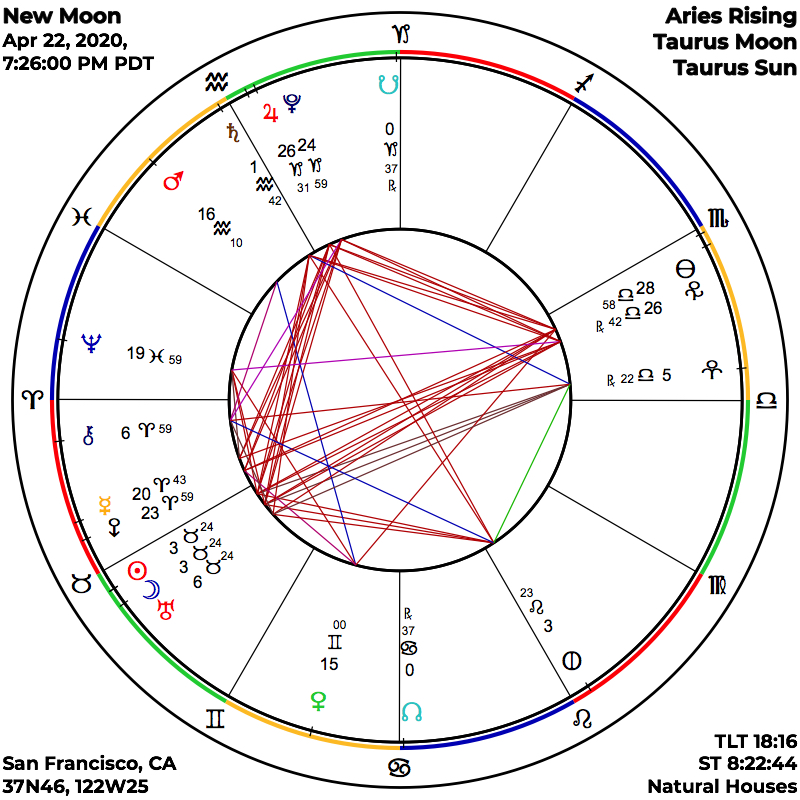 Wednesday’s New Moon, taking place on the evening of Earth Day, April 22nd, at 7:26 PM on the west coast, late evening to early morning the 23rd for the east coast and Europe, is another dynamic lunation, featuring Uranus in Taurus, conjuncted by the Sun and Moon, and also Pluto in Capricorn, which is conjunct Jupiter, square Eris in Aries, and also – on the other side of the zodiac – square to Haumea, another of these new “dwarf” planets, and one representing profound connection to Nature. More details on this important T-square to Jupiter-Pluto in the paragraphs that follow. The New Moon itself, because taking place in the Earth sign of Taurus, is redolent of the springtime renewal of earth’s energies, and signals an impatience to be getting on with something of greater interest and significance than passively waiting for better testing and treatment of the coronavirus pandemic that over the past two months has so gripped the world. We can see the protests to continued sheltering in place happening in various cities. Inside each of our hearts is this call to novelty and adventure, especially with Uranus only a few degrees away from the burgeoning New Moon energy. Let me hasten to add that I am not in any way advocating for moving faster with opening up the economy than makes sense for the public health, in containing the rampant and widely spreading infection of Covid-19. This must, in fact, likely proceed far more slowly that anyone would like it to, affecting even areas that have tried to avoid the social isolation that has been a major key to slowing the spread, or “flattening the curve” of the infection. I am merely indicating that impatience with stay-at-home is likely to become even more pronounced in the coming weeks of this new lunation cycle originating with this volatile New Moon. With both Uranus and Pluto thus highlighted, we might also be reminded now of the Uranus-Pluto opening square, powerfully activated all last decade and still relevant in its relatively slow gestation of new communal forms beginning to emerge into the mainstream. This astrological factor is not as potent in 2020 as formerly, but is still an important consideration, as we continue to evolve collectively and individually into an uncertain future. This 21st century is fraught with massive social change, as we are now seeing, plus with regard to the ever-present advance of climate change looming, and with an ever-increasing awareness of how this factor may come to dominate our societal evolution.