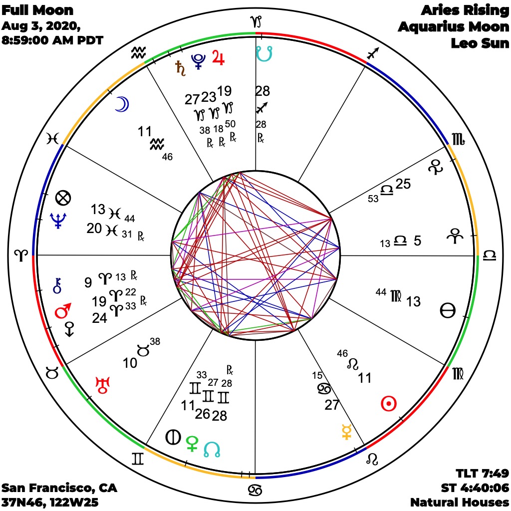 Monday’s Aquarius Full Moon, taking place in the morning of August 3rd, exhibits strong configurations of outer planets that have been quite consistent lately, with the usual suspects: Saturn, Pluto, and the new planet, Eris, Feminine Warrior for soul intention. These are all highlighted as the T-square from Eris and Haumea to Jupiter-Pluto-Saturn continues into the August cycle. Haumea, named for the creation goddess of the Hawaiian culture, is another of these new planets beyond Pluto, and the astrological archetype seems to be involved with many varieties of “profound connection to Nature.” These are all quite interesting of course, and in their combination indicates that the Covid cultural reset is still going strong, and that it features not only massive structural transformation of the society, and of the individuals within it struggling to find their way forward, but also the idea that it is high time for each and every one of us to make their bottom-line values fully known, to themselves and to others, and to begin to act upon these, in accordance with a growing awareness and respect for natural law.