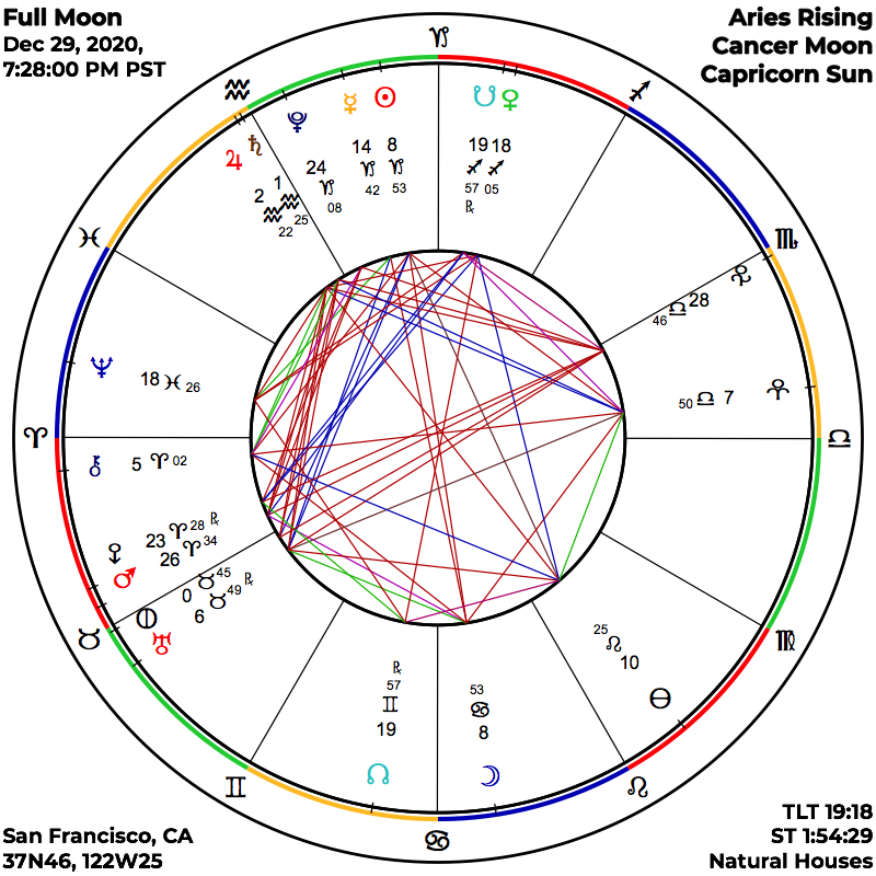 The final Full Moon of 2020 graces us with the sweet and swift waters of the sign of Cancer, where the Moon is most at home. Taking place at 7:28 pm Pacific Time on the evening of December 29th, this Full Moon sends us out of 2020 with a sober outlook mixed with a dash of inspired action and imagination, as we face our collective future and the complexity and challenges of our current evolutionary unfolding.