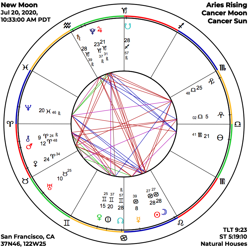Monday’s New Moon, taking place on the morning of July 20th for the west coast, afternoon or early evening for the east coast and Europe, is another one that features the limitations and constrictions of Saturn, plus transformational Pluto. Recent lunations, especially the solstice eclipse New Moon of June 20th - 21st, have strongly featured Saturn, so that this late July lunation represents a continuation of that emphasis. Certainly there has been abundant evidence of Saturn’s presence in recent headlines, in the retreat back toward lock-down that we have been seeing over this past cycle, at least in America, as the coronavirus tightens its hold, and our economic recovery stalls.