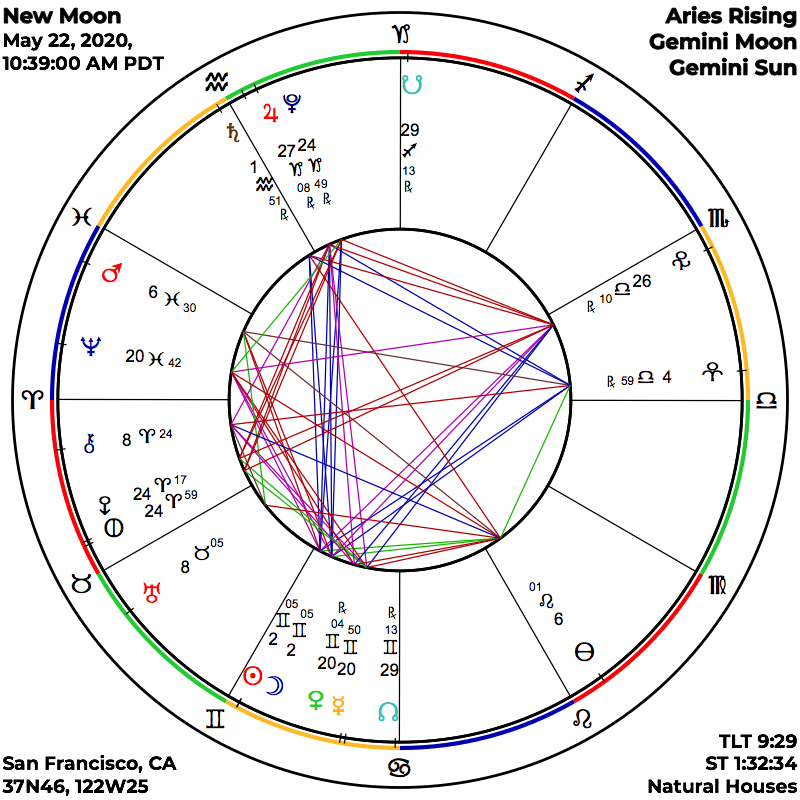 Friday morning’s Gemini New Moon, early afternoon to early evening for the east coast and Europe, takes place on May 22nd, at 2 + degrees of the sign of Gemini. This New Moon is therefore in close trine to a recently stationing Saturn, occupying the second degree of Aquarius. That the Sun and Moon in this New Moon are closely quintile to numinous Neptune, residing in its own sign of Pisces, is extremely significant also, especially considering the close square to Neptune provided by retrograde Venus, which stationed ten days prior, and is still moving slowly. Mercury, also getting ready to retrograde next month, occupies the same degree of Gemini as Venus. That is quite a lot of Neptune in this New Moon configuration! Along with an antithetical dose of practical Saturn, this makes for a schizoid attitude toward questions of fantasy versus reality. One way to look at this preponderance of Neptune in this New Moon, and for the next thirty days of this lunation cycle, is that we all need a little escape from time to time, especially with all the societal difficulties that we are currently attempting to navigate. Over the remainder of this lunation cycle, that coping mechanism might become even more prevalent.