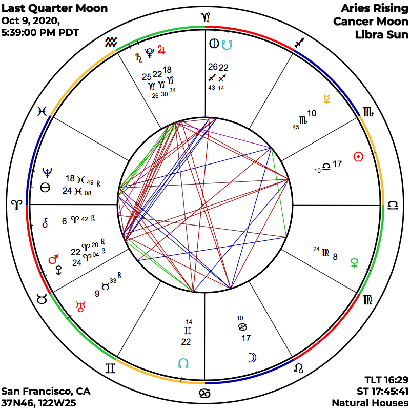 Meanwhile, the transformative signature of Saturn-Pluto-Jupiter stays extremely potent also. Retrograde Mars lies in partile, or same-degree, square with Pluto – with Eris less than two degrees away from Mars, herself in perfect square to the Saturn-Pluto midpoint. This is with the new Nature planet, Haumea, located at 27 + of Libra, only three degrees away from a perfect square and opposition to these points. The societal transformation sparked by Covid and Black Lives Matter, plus economic devastation, therefore goes on apace. This Last Quarter Moon furthermore represents a phase that notable 20th-century master astrologer Dane Rudhyar termed a “crisis of consciousness.” We, each one of us, individually, need to find our part within it.