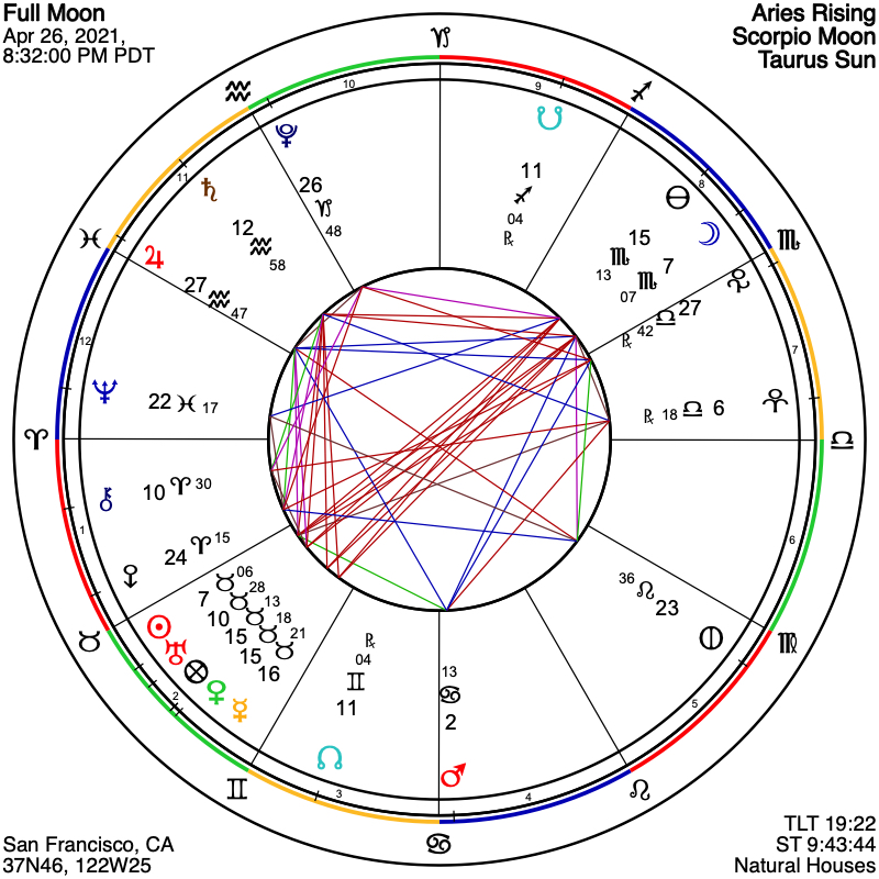 This Full Moon chart features the Taurus Sun conjunct Uranus opposite the Scorpio Moon, and has Saturn in Aquarius completing the picture by making a T-square to all three. Saturn square Uranus is a long-term aspect that is in effect for the entirety of this year and into January of 2022. The dynamic tension of Uranus-Saturn heightens the liminal space where that which is emergent rubs up against that which is already established. It is through this tension between the existing and the forthcoming that new paradigms are born, and I think it’s safe to say that this is not generally a tidy nor a comfortable process. Rather, it stretches us and re-forms the very foundations and frameworks that give shape to our self-concepts, beliefs, and world views. It’s important to note that these energies are coming about in Fixed signs and, that while Fixed can yield, it does not yield easily. There can be a tendency towards brittleness and calcification that gets in the way of necessary evolutionary progress. It may be a good idea during this emerging year to seek activities and practices that foster qualities of flexibility, spaciousness, and gentle motion in all aspects of our being.