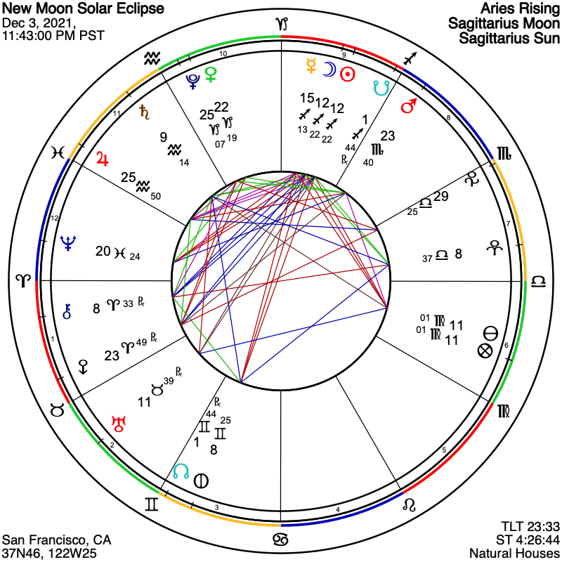 A powerful Solar Eclipse and New Moon takes place on the late evening of Friday, December 3rd, Pacific Time, early morning of December 4th for points east, signaling the beginning of a new cycle of great archetypal significance as we head into the Christmas holiday season and the New Year of 2022. The influence of an eclipse such as this is said to last for six months, so this chart alone gives us a preview for the new year that is to come. One important thing to mention is that the tremendous and divisive polarities of the political scene here in the U.S. and elsewhere in the world are not getting any better, as indicated by the prominence of both Saturn and Uranus in this eclipse chart, with the square between them becoming ever closer as the December cycle continues to unfold.