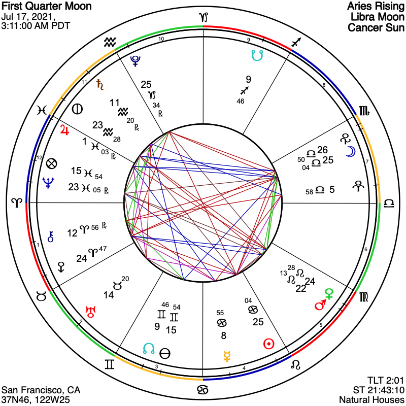 The First Quarter Moon taking place on Saturday, July 17th, is a rather interesting lunation, being the opening square with the Moon in the same degree of Libra as the Sun is in Cancer, 25 degrees of Cancer, and with the Sun also in partile opposition to Pluto in Capricorn. The impact of this dynamic quarter Moon configuration is huge, since it aspects several outer planets, notably Pluto and Neptune, with aspects also to new planets Eris and Haumea, only recently discovered and named by the IAU (International Astronomers Union) as KBO planets. With Pluto involved so directly we might expect further transformation on a societal and an individual level, as we have been witnessing in this significant decade, and as we are collectively on our way to a newly restructured society that, for better or for worse, is emerging.