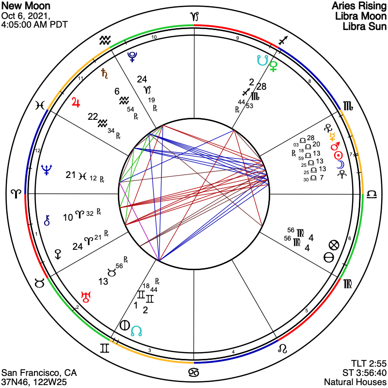 The Libra New Moon of October 6th initiates this next lunar cycle with some passionate emotions, plenty of healing opportunities in our relationships, and pattern-interrupts that may require us to get innovative in our approach. The heat is turned up on this New Moon because our fiery friend Mars is less than a degree from the Sun and Moon, making a partile or same-degree conjunction at 13 degrees Libra. Because Mars operates a bit differently in Libra, his influence here is somewhat diluted, and this could help soften the edges of any anger that might come up, yet this energy may also lurk around as resentment, quiet exasperation, or passive aggression. With Mercury Retrograde nearby at 20 Libra, there will be no shortage of annoyances, triggers, and opportunities to get present with our internal experience of our buttons getting pushed. The good news is that with Mars so strongly in the picture, there is also ample energetic fuel available to harness our willpower, know when to say enough is enough, and make the changes in awareness, attitude, and active engagement that could result in greater healing for ourselves and our relationships.