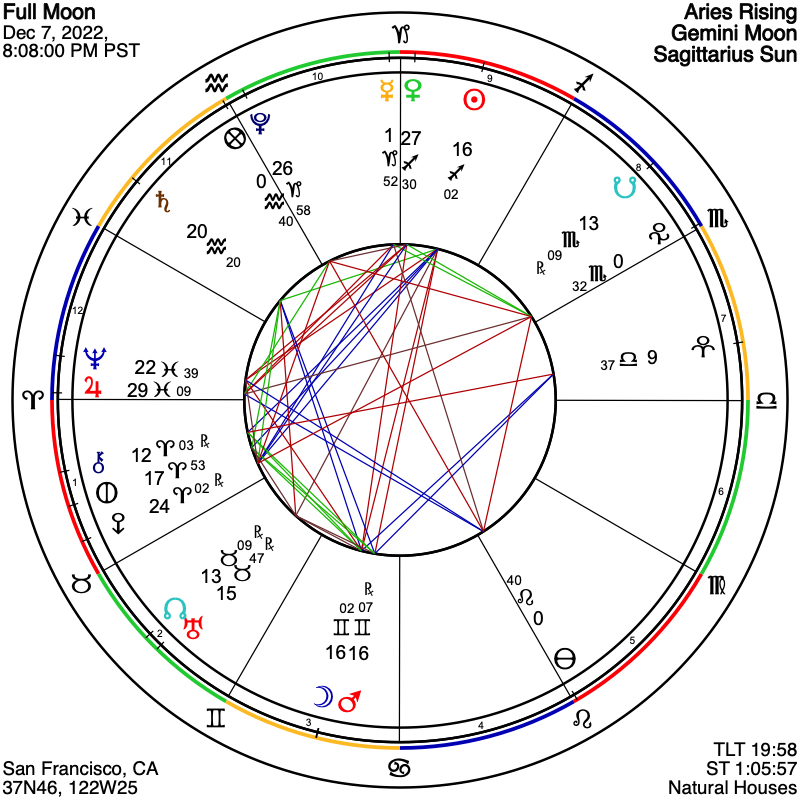 This Full Moon is also echoing the energies of the recent Full Moon Eclipse in Taurus, which had its 16-degree mark of Taurus conjunct Uranus’ presence, to the degree. This is repeated in the current configuration by Moon-Mars exactly 30 degrees away at 16 Gemini, and therefore brings that recent eclipse into the picture of this December event. We are invited to look back on recent weeks with the potential for keener insight and even for startling epiphanies to emerge, now, on the process that is still unfolding for us as 2022 draws to a close.