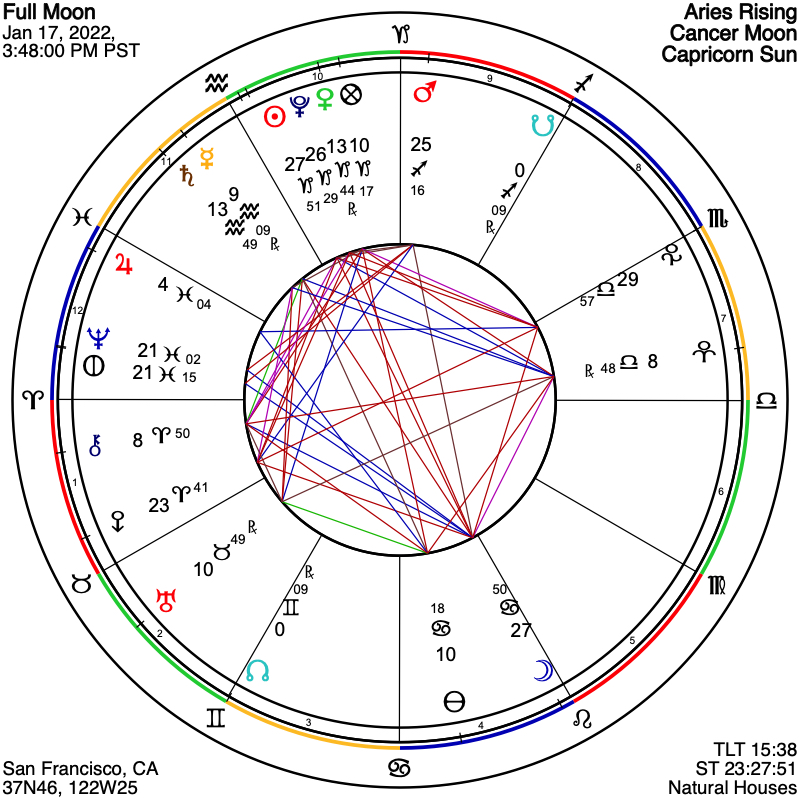 Monday’s Cancer Full Moon, taking place in the afternoon of January 17th, PT, evening or late evening for points east, past midnight for Central Europe, represents a culmination of the recent quite difficult New Moon from the 2nd, on New Year’s Day weekend. That month-opening New Moon chart was cautionary, with the Saturn-Uranus ongoing square alignment very much emphasized, indicating tension on an individual level and a widening gulf between right wing and left wing political perspectives, as well as prominent Pluto indicating societal and personal transformation on a grand scale. We might expect the closing two weeks of this lunation to be equally fraught and indeed this is evidently the case. Passionate Mars and transformational Pluto are both still emphasized in this Full Moon, with the Sun conjunct Pluto and the Moon opposed. Venus remains in retrograde motion, signaling an ongoing revision of values and relationship dynamics, and is now joined in that retrogradation by Mercury, beginning to move backward through the neighboring sign of Aquarius, and aspecting both Saturn and Uranus as it stations. This is therefore a particularly difficult upcoming two weeks, with as well a strong retrograde period that we are now engaged in, adding another introspective layer of complexity to what was already a wild and potentially surprising January month.