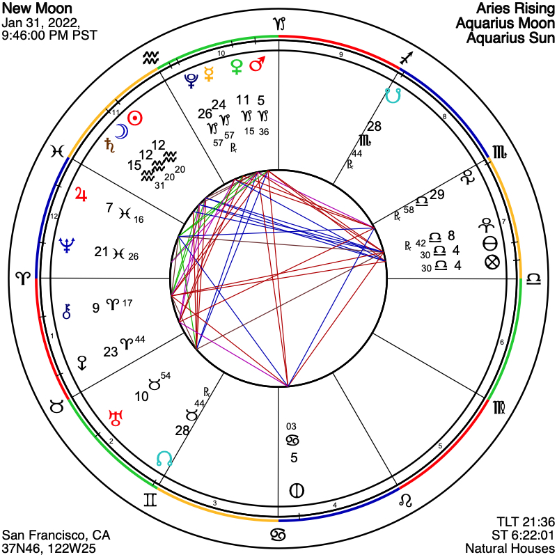 The New Moon in Aquarius is ushering in this lunar cycle with fresh eyes for old patterns, yet also an underlying buzz of electric tension. It strikes its exact position on January 31st at 9:46pm Pacific time, at 12º of Aquarius. This lunation is setting the tone for the whole month of February, and, taking place as it does in the fixed air sign of Aquarius, it lends our minds and hearts to seeing the big picture, and fosters innovative pathways and humanitarian causes. The planetary signatures of this New Moon chart spell out a continued intensity, with more potential for chaotic turbulence, yet, as always, further opportunities for growth, grace, and expansion into well-being.